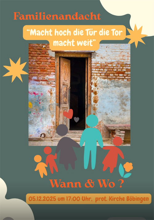 Ab 17 Uhr dürfen alle Familien in die Prot. Kirche Böbingen dazukommen und eine stimmungsvolle Familienandacht miterleben.