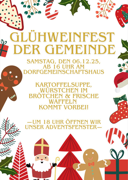 - Freitag, 19. Dezember: 18:00 Uhr Adventsfenster im Hof bei Familie Sosnowski, Hauptstraße 111